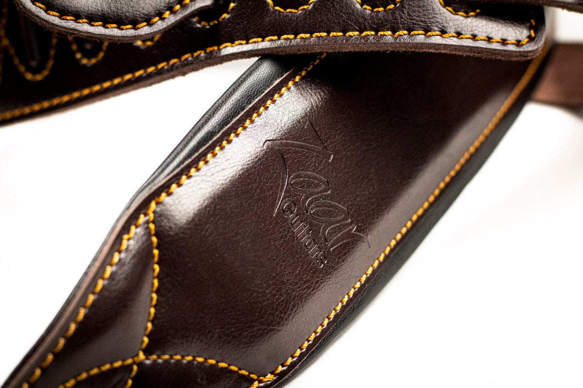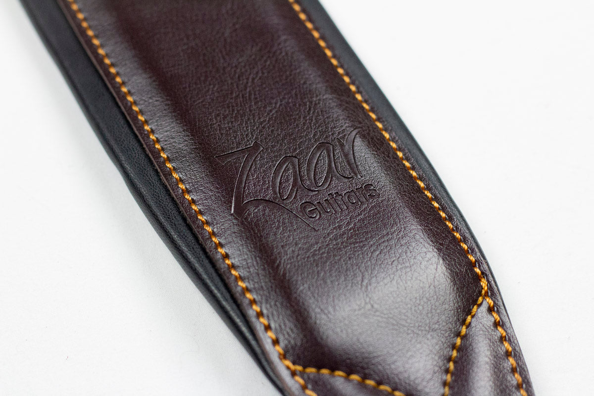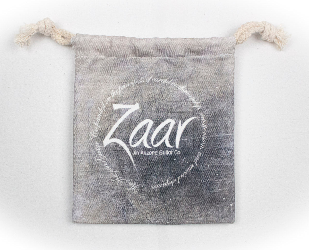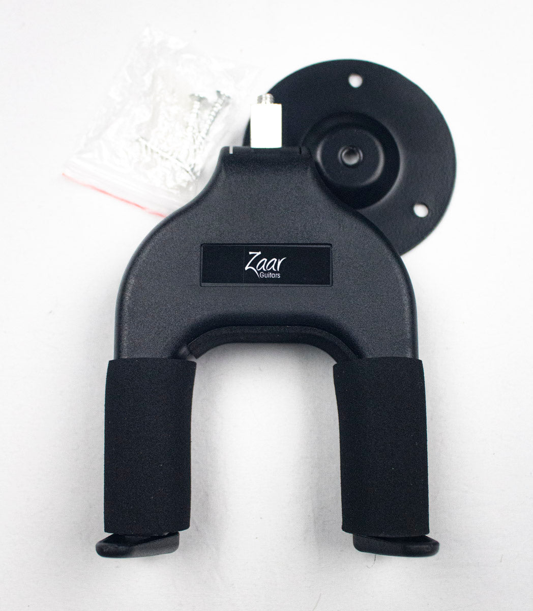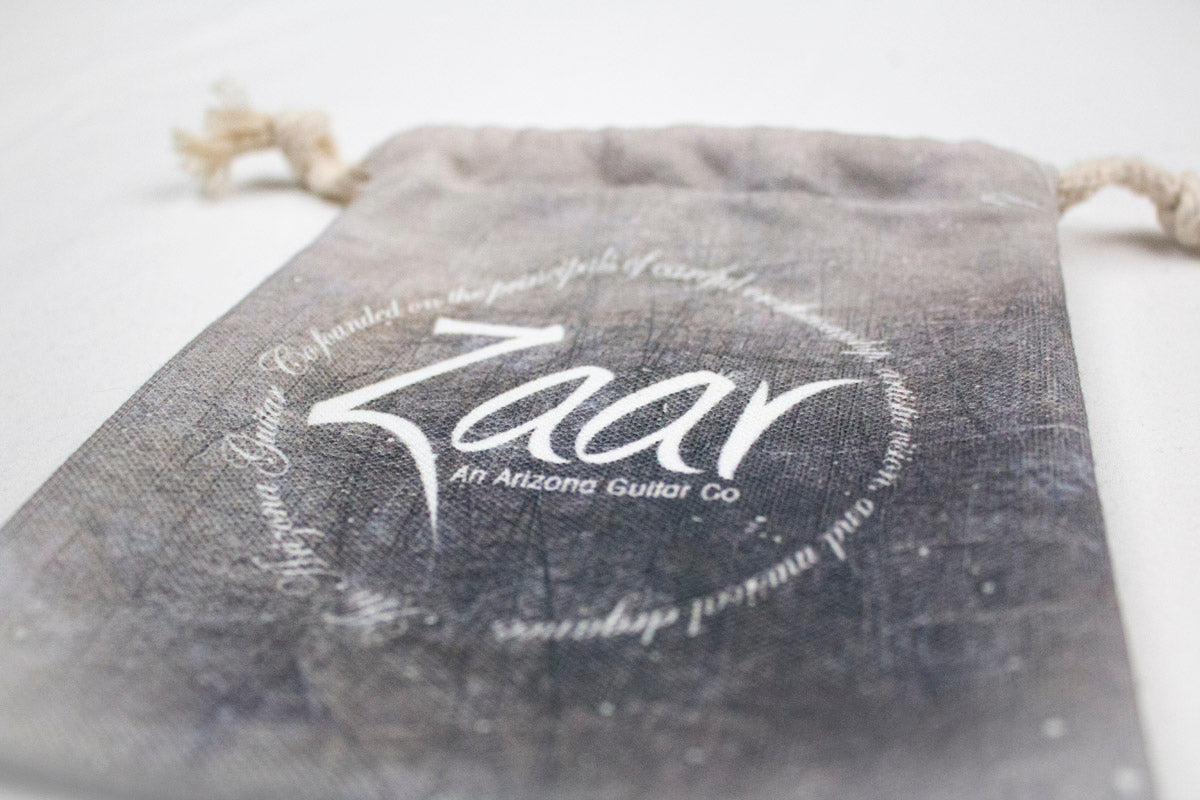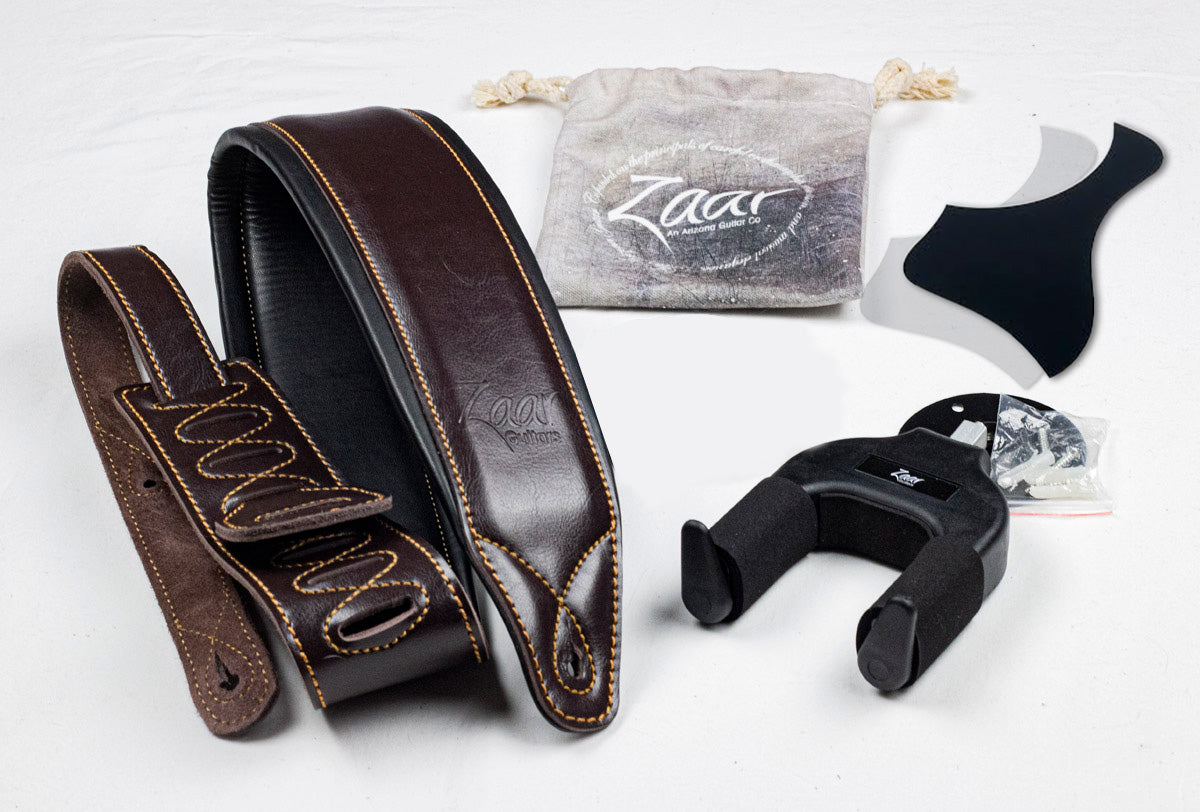 Full-grain leather padded guitar strap w/ Zaar logo, 2 flexible pickguards (1 black and 1 transparent), wall hanger, and pouch.